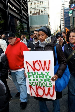 “We as parents and community are watching Mayor Bloomberg’s failed agenda,” shouted South Bronx father Jose Gonzalez, utilizing the laborious human mic. “A lot of schools are closing and students are failing!” The solution for poor educational outcomes, Gonzalez said, is for Gov. Andrew Cuomo and the state legislature to levy a millionaire’s tax and use the resulting funds to lower class sizes; improve teacher professional development; expand access to music and art classes; and provide counseling, pre-K, and other “wraparound” social supports for all children.