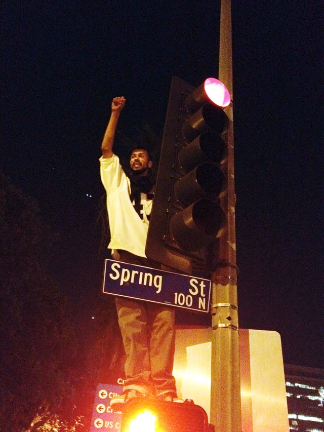 Late last night, the LAPD raided Occupy Los Angeles. More than 1400 police officers — about 15% of the city’s officers — were used to arrest more than 200 people, leaving the encampment in a shambles. Teams of police wore hazmat suits and K-9 units swept the camp, looking for incendiary devices, which they did not find. The tactical approach, guided by LAPD Chief Charlie Beck on-site, involved eventually cordoning off City Hall Park and arresting everyone trapped inside. The operation was concluded by 3:30 a.m.