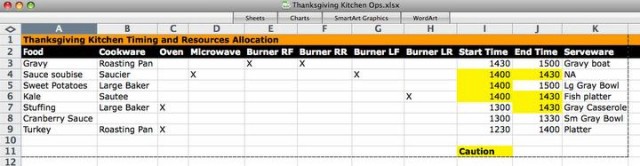 You need to have your menu written out, and a fairly solid idea how long things take to cook. You should also know what time you want to serve the Thanksgiving meal. Make sure you know which/how many pots and pans fit on your stovetop at the same time, and what baking dishes you can fit in your oven while the turkey is in there — adjust the racks so you can test for vertical space, too.