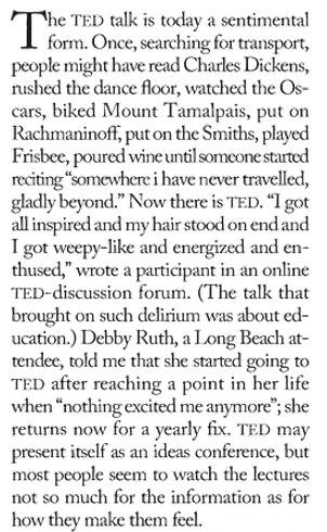 How TED works: de-facted emotional appeals, shot well, crafted into parables of the good life. (In the New Yorker, subscription-only.)