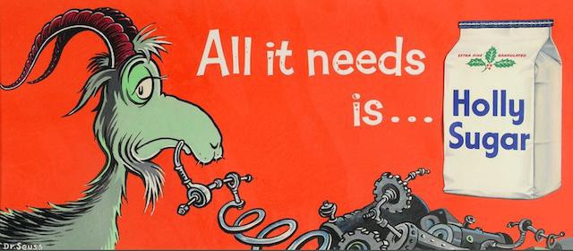 Tomorrow — Thursday, January 23 — Swann will auction off an advertisement Geisel drew for Holly Sugar sometime in the 1950s. They estimate the mounted gouache and collage drawing, featuring a skeptical-looking goat against a orange backdrop, to be worth $30,000 to $40,000. This drawing, at about half the size, sold for $21,600 a year ago; this small drawing sold for $33,460, three times the estimate, back in 2002.