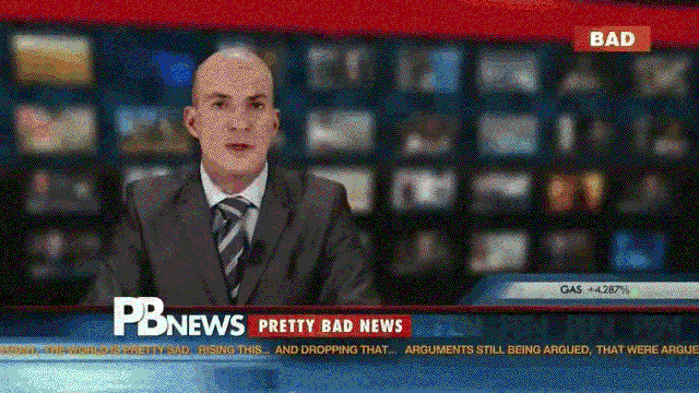 Earlier, in the “Pretty Bad News” clip, a chyron scrolling along the bottom of the screen parodically proclaims “Rising this… and dropping that… arguments still being argued that.”