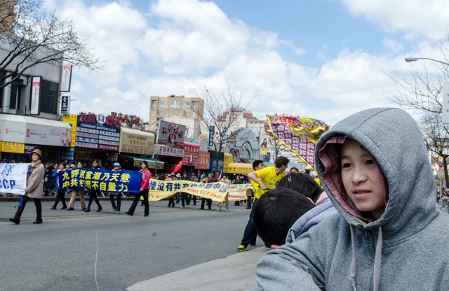 Dozens called foul in Flushing, Queens on Saturday, unable to cross Main Street due to a parade of nearly 1,000 Falun Gong practitioners protesting persecution in China.